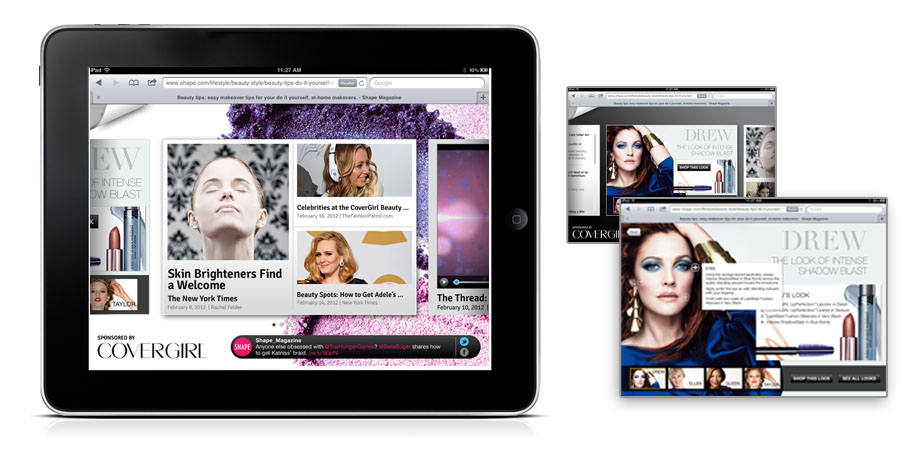 Interactive Advertorial for ipad "Tapestry" pulls in relevant beauty content and allows the user to interact with the Covergirl Celebrity looks and videos.